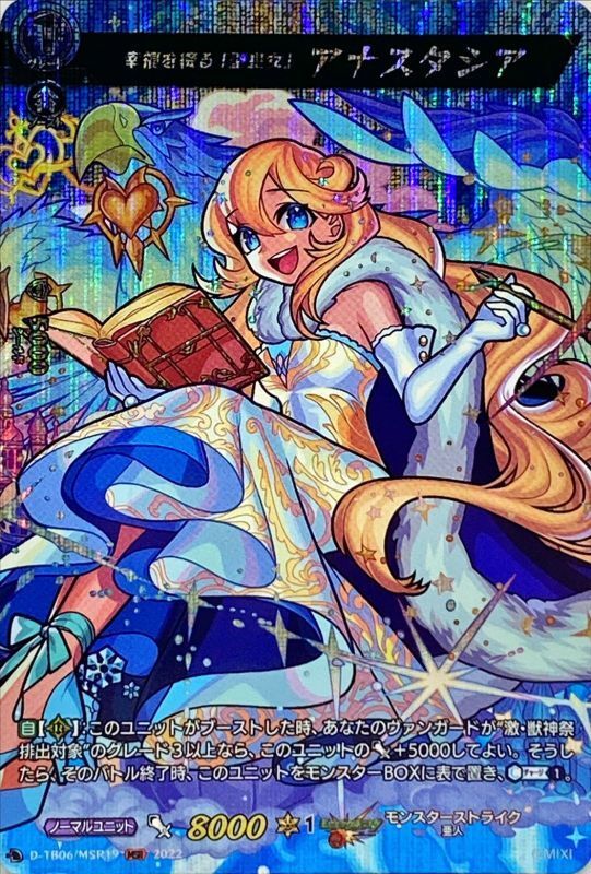 【自】【(R)】:このユニットがブーストした時、あなたのヴァンガードが“激・獣神祭排出対象”のグレード3以上なら、このユニットのパワー+5000してよい。そうしたら、そのバトル終了時、このユニットをモンスターBOXに表で置き、【カウンターチャージ】(1)。