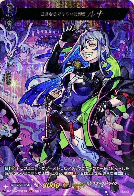 【自】【(R)】:このユニットがブーストしたアタックがヴァンガードにヒットした時、あなたのユニットが3枚以上なら、【ソウルチャージ】(1)。6枚以上なら、さらに【カウンターチャージ】(1)。