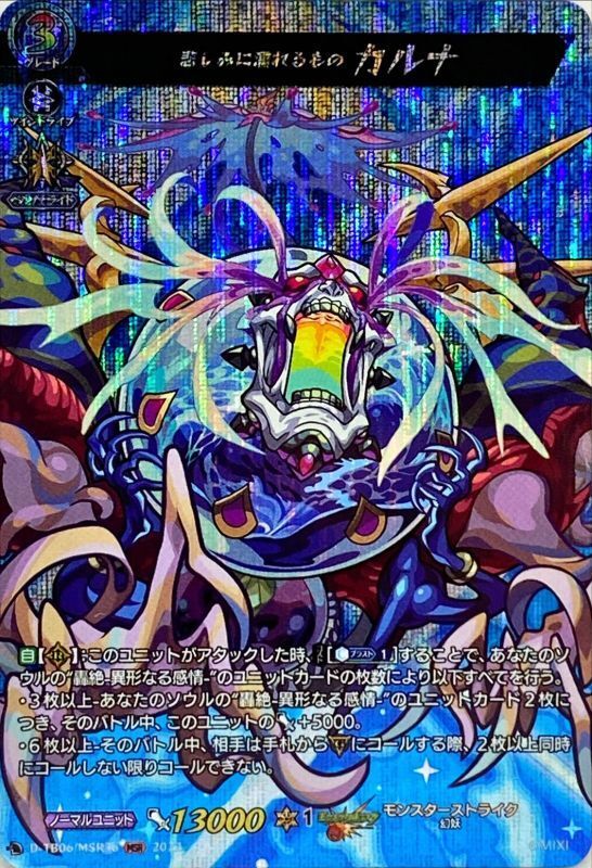 【自】【(R)】:このユニットがアタックした時、【コスト】[【カウンターブラスト】(1)]することで、あなたのソウルの“轟絶-異形なる感情-”のユニットカードの枚数により以下すべてを行う。・3枚以上-あなたのソウルの“轟絶-異形なる感情-”のユニットカード2枚につき、そのバトル中、このユニットのパワー+5000。・6枚以上-そのバトル中、相手は手札から(G)にコールする際、2枚以上同時にコールしない限りコールできない。