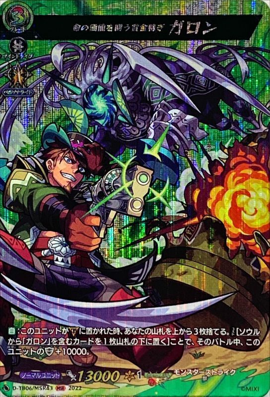 【自】:このユニットが(G)に置かれた時、あなたの山札を上から3枚捨てる。【コスト】[ソウルから「ガロン」を含むカードを1枚山札の下に置く]ことで、そのバトル中、このユニットのシールド+10000。