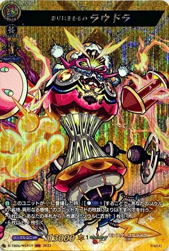 【自】:このユニットが(R)に登場した時、【コスト】[【カウンターブラスト】(1)]することで、あなたのソウルの“轟絶-異形なる感情-”のユニットカードの枚数により以下すべてを行う。・3枚以上-あなたの手札から1枚選び、ソウルに置き、1枚引く。・6枚以上-1枚引く。