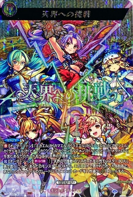 【イベント】【永】【オーダーゾーン】:「ミカエル」か「カマエル」か「ラミエル」か「ラファエル」か「ガブリエル」か「ザドキエル」か「ビナー」か「ウリエル」か「サンダルフォン」か「ルシファー」か「メタトロン」を含むあなたのカードすべては“天界の守護者”になる。【起】【オーダーゾーン】【ターン1回】:【コスト】[“天界の守護者”のリアガードを1枚モンスターBOXに表で置く]ことで、あなたのモンスターBOXから、このコストで置かれたカードと別名で、あなたのヴァンガードのグレード以下のユニットカードを1枚選び、(R)にコールする。