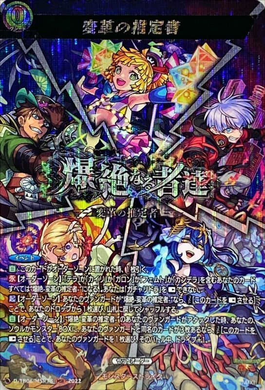 【イベント】【自】:このカードがオーダーゾーンに置かれた時、1枚引く。【永】【オーダーゾーン】:「テラ」か「カイリ」か「ガロン」か「フェムト」か「カンデラ」を含むあなたのカードすべては“爆絶-変革の推定者-”になる。あなたは「ガチャリドラ」を【レスト】できない。【起】【オーダーゾーン】:あなたのヴァンガードが“爆絶-変革の推定者-”なら、【コスト】[このカードを【レスト】させる]ことで、あなたのドロップから1枚選び、山札に戻してシャッフルする。【自】【オーダーゾーン】:“爆絶-変革の推定者-”のあなたのヴァンガードがアタックした時、あなたの、ソウルかモンスターBOXに、あなたのヴァンガードと同名のカードが3枚あるなら、【コスト】[このカードを【レスト】させる]ことで、あなたのヴァンガードを1枚選び、そのバトル中、ドライブ+1。