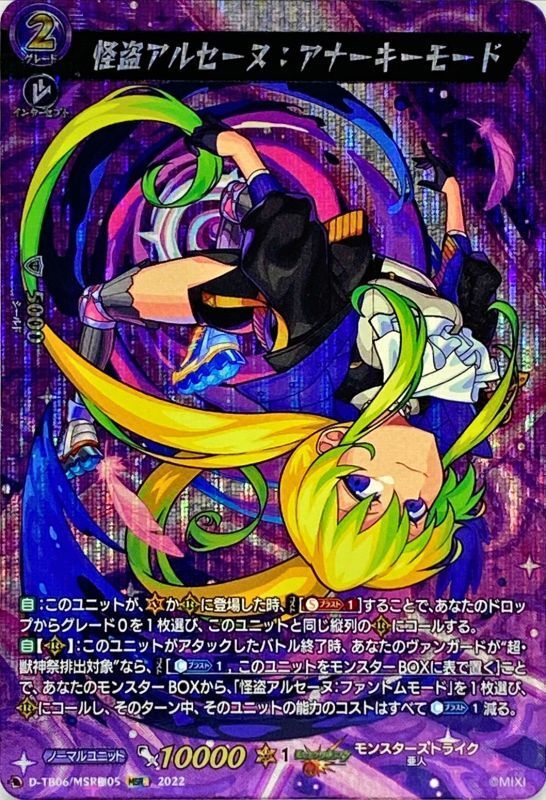 【自】:このユニットが、(V)か(R)に登場した時、【コスト】[【ソウルブラスト】(1)]することで、あなたのドロップからグレード0を1枚選び、このユニットと同じ縦列の(R)にコールする。【自】【(R)】:このユニットがアタックしたバトル終了時、あなたのヴァンガードが“超・獣神祭排出対象”なら、【コスト】[【カウンターブラスト】(1),このユニットをモンスターBOXに表で置く]ことで、あなたのモンスターBOXから、「怪盗アルセーヌ:ファントムモード」を1枚選び、(R)にコールし、そのターン中、そのユニットの能力のコストはすべて【カウンターブラスト】(1)減る。