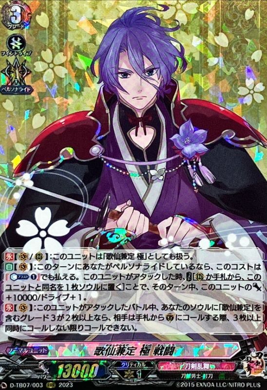 【永】【(V)/(R)】:このユニットは「歌仙兼定 極」としても扱う。【自】【(V)】:このターンにあなたがペルソナライドしているなら、このコストは『【カウンターブラスト】(1)』でも払える。このユニットがアタックした時、【コスト】[(R)か手札から、このユニットと同名を1枚ソウルに置く]ことで、そのターン中、このユニットのパワー+10000/ドライブ+1。【永】【(V)】:このユニットがアタックしたバトル中、あなたのソウルに「歌仙兼定」を含むグレード3が2枚以上なら、相手は手札から(G)にコールする際、3枚以上同時にコールしない限りコールできない。