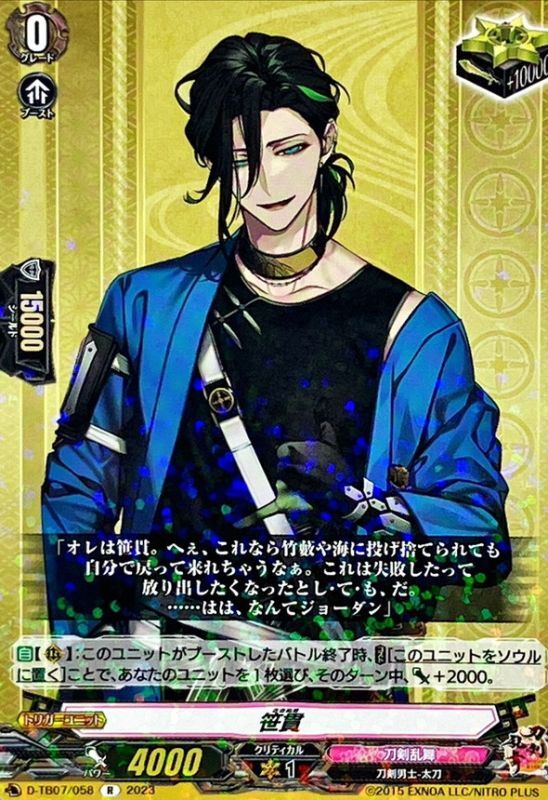 フレバーテキスト:「オレは笹貫。へぇ、これなら竹藪や海に投げ捨てられても自分で戻って来れちゃうなぁ。これは失敗したって放り出したくなったとし・て・も、だ。……はは、なんてジョーダン」