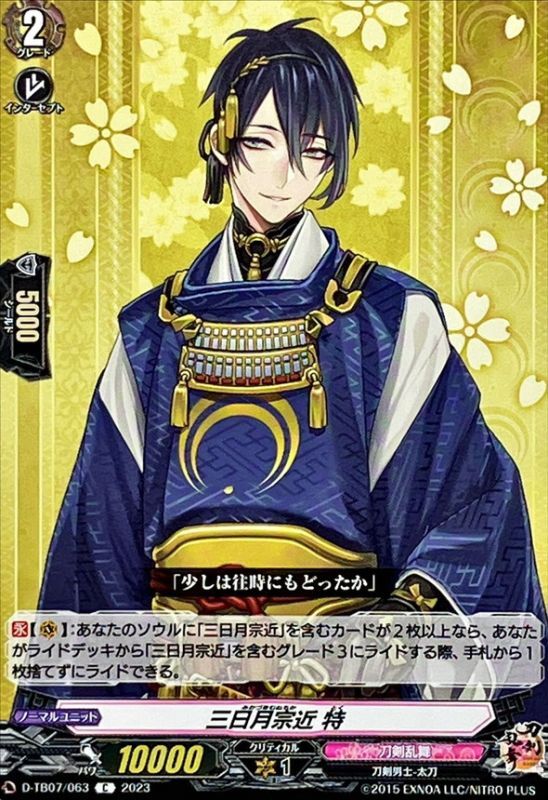 【永】【(V)】:あなたのソウルに「三日月宗近」を含むカードが2枚以上なら、あなたがライドデッキから「三日月宗近」を含むグレード3にライドする際、手札から1枚捨てずにライドできる。