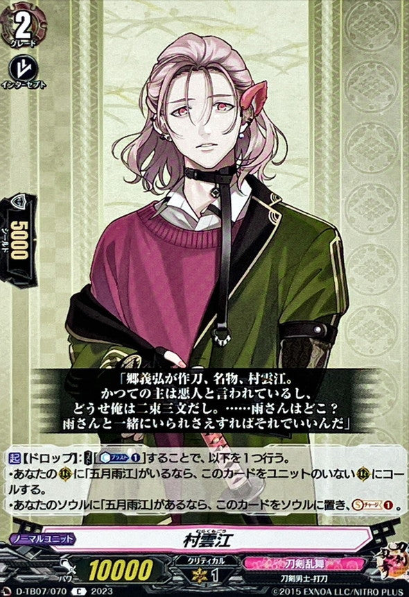 フレバーテキスト:「郷義弘が作刀、名物、村雲江。かつての主は悪人と言われているし、どうせ俺は二束三文だし。……雨さんはどこ? 雨さんと一緒にいられさえすればそれでいいんだ」