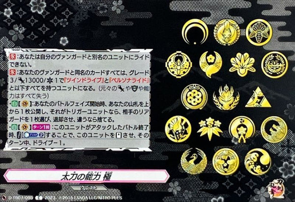 【永】:あなたは自分のヴァンガードと別名のユニットにライドできない。【永】:あなたのヴァンガードと同名のカードすべては、グレード3/パワー13000/クリティカル1で『ツインドライブ』と『ペルソナライド』と以下すべてを持つユニットになる。(元々のパワーやシールドや能力はすべて失う)・【自】【(V)】:あなたのバトルフェイズ開始時、あなたの山札を上から1枚公開し、それがトリガーユニットなら、相手のリアガードを1枚選び、退却させ、違うなら捨てる。・【自】【(V)】【ターン1回】:このユニットがアタックしたバトル終了時、【コスト】[【カウンターブラスト】(2)]することで、このユニットを【スタンド】させ、そのターン中、ドライブ-1。