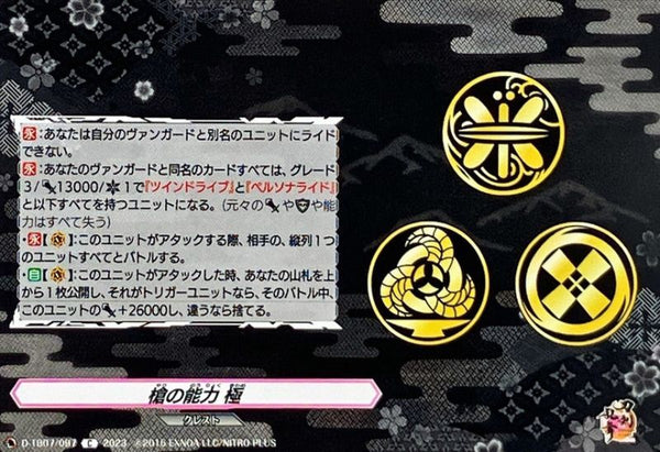 【永】:あなたは自分のヴァンガードと別名のユニットにライドできない。【永】:あなたのヴァンガードと同名のカードすべては、グレード3/パワー13000/クリティカル1で『ツインドライブ』と『ペルソナライド』と以下すべてを持つユニットになる。(元々のパワーやシールドや能力はすべて失う)・【永】【(V)】:このユニットがアタックする際、相手の、縦列1つのユニットすべてとバトルする。・【自】【(V)】:このユニットがアタックした時、あなたの山札を上から1枚公開し、それがトリガーユニットなら、そのバトル中、このユニットのパワー+26000し、違うなら捨てる。