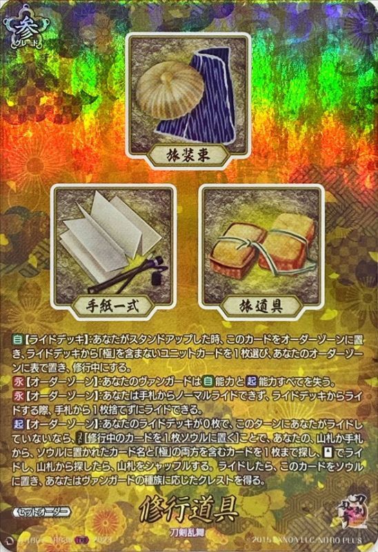 【自】【ライドデッキ】:あなたがスタンドアップした時、このカードをオーダーゾーンに置き、ライドデッキから「極」を含まないユニットカードを1枚選び、あなたのオーダーゾーンに表で置き、修行中にする。【永】【オーダーゾーン】:あなたのヴァンガードは【自】能力と【起】能力すべてを失う。【永】【オーダーゾーン】:あなたは手札からノーマルライドできず、ライドデッキからライドする際、手札から1枚捨てずにライドできる。【起】【オーダーゾーン】:あなたのライドデッキが0枚で、このターンにあなたがライドしていないなら、【コスト】[修行中のカードを1枚ソウルに置く]ことで、あなたの、山札か手札から、ソウルに置かれたカード名と「極」の両方を含むカードを1枚まで探し、【スタンド】でライドし、山札から探したら、山札をシャッフルする。ライドしたら、このカードをソウルに置き、あなたはヴァンガードの種族に応じたクレストを得る。
