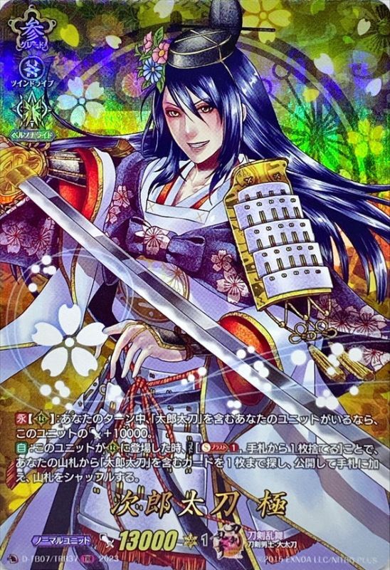 【永】【(R)】:あなたのターン中、「太郎太刀」を含むあなたのユニットがいるなら、このユニットのパワー+10000。【自】:このユニットが(R)に登場した時、【コスト】[【ソウルブラスト】(1),手札から1枚捨てる]ことで、あなたの山札から「太郎太刀」を含むカードを1枚まで探し、公開して手札に加え、山札をシャッフルする。