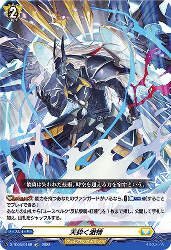 【レヴォルドレス】能力を持つあなたのヴァンガードがいるなら、【コスト】[【カウンターブラスト】(1)]することでプレイできる!あなたの山札から「ユースベルク“反抗黎騎・紅蓮”」を1枚まで探し、公開して手札に加え、山札をシャッフルする。