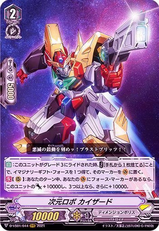 【自】:このユニットがグレード3にライドされた時、【コスト】[手札から1枚捨てる]ことで、イマジナリーギフト・フォースを1つ得て、そのマーカーを(V)に置く。【永】【(R)】:あなたのターン中、あなたの(V)にフォース・マーカーがあるなら、このユニットのパワー+10000し、3つ以上なら、さらに+10000。