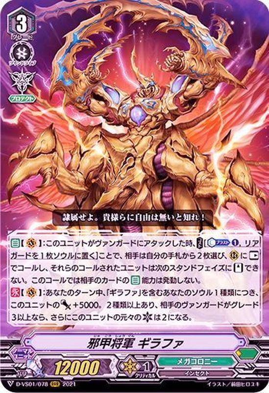【自】【(V)】:このユニットがヴァンガードにアタックした時、【コスト】[【カウンターブラスト】(1),リアガードを1枚ソウルに置く]ことで、相手は自分の手札から2枚選び、(R)に【レスト】でコールし、それらのコールされたユニットは次のスタンドフェイズに【スタンド】できない。このコールでは相手のカードの【自】能力は発動しない。【永】【(V)】:あなたのターン中、「ギラファ」を含むあなたのソウル1種類につき、このユニットのパワー+5000。2種類以上あり、相手のヴァンガードがグレード3以上なら、さらにこのユニットの元々のクリティカルは2になる。