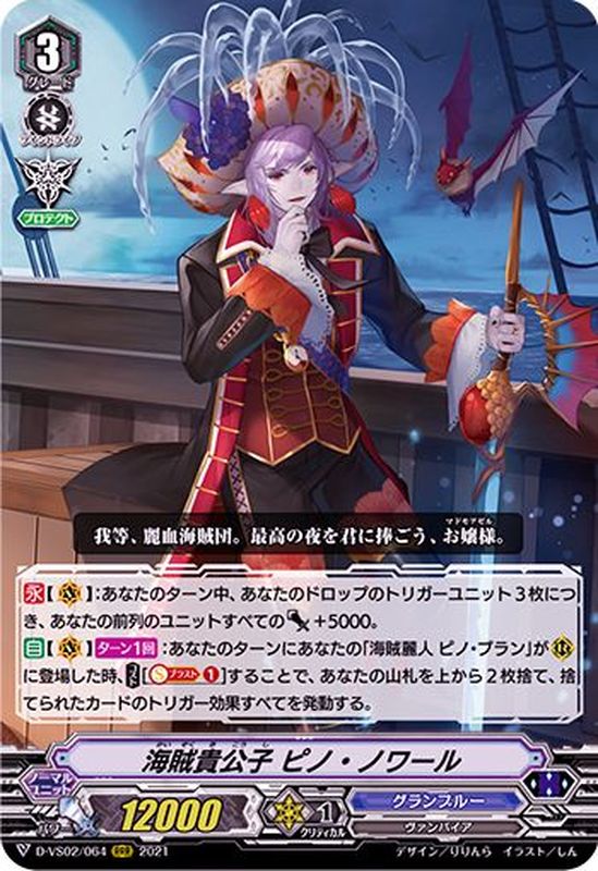 【永】【(V)】:あなたのターン中、あなたのドロップのトリガーユニット3枚につき、あなたの前列のユニットすべてのパワー+5000。【自】【(V)】【ターン1回】:あなたのターンにあなたの「海賊麗人 ピノ・ブラン」が(R)に登場した時、【コスト】[【ソウルブラスト】(1)]することで、あなたの山札を上から2枚捨て、捨てられたカードのトリガー効果すべてを発動する。