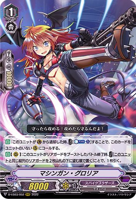 【自】:このユニットが(G)から退却した時、【コスト】[【カウンターブラスト】(1)]することで、このカードをユニットのいない(R)にコールする。【自】【(R)】:このユニットがリアガードをブーストしたバトル終了時、【コスト】[このユニットと同じ縦列のリアガードを2枚山札の下に望む順で置く]ことで、1枚引く。