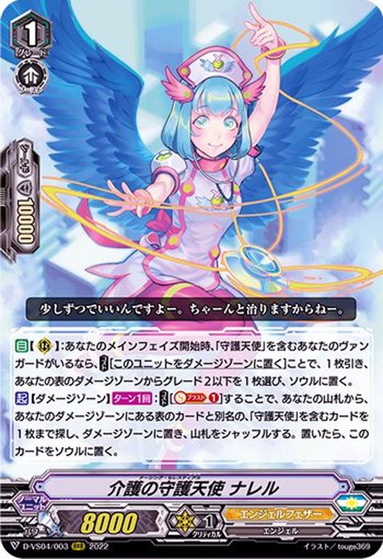 【自】【(R)】:あなたのメインフェイズ開始時、「守護天使」を含むあなたのヴァンガードがいるなら、【コスト】[このユニットをダメージゾーンに置く]ことで、1枚引き、あなたの表のダメージゾーンからグレード2以下を1枚選び、ソウルに置く。【起】【ダメージゾーン】【ターン1回】:【コスト】[【ソウルブラスト】(1)]することで、あなたの山札から、あなたのダメージゾーンにある表のカードと別名の、「守護天使」を含むカードを1枚まで探し、ダメージゾーンに置き、山札をシャッフルする。置いたら、このカードをソウルに置く。