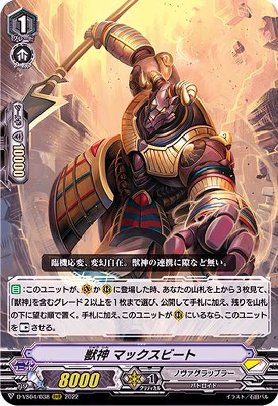 【自】:このユニットが、(V)か(R)に登場した時、あなたの山札を上から3枚見て、「獣神」を含むグレード2以上を1枚まで選び、公開して手札に加え、残りを山札の下に望む順で置く。手札に加え、このユニットが(R)にいるなら、このユニットを【レスト】させる。
