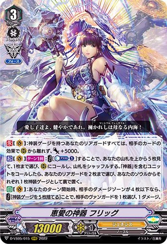 【永】【(V)】:神装ゲージを持つあなたのリアガードすべては、相手のカードの効果で(R)から離れず、パワー+5000。【起】【(V)】【ターン1回】:【コスト】[【カウンターブラスト】(1)]することで、あなたの山札を上から5枚見て、1枚まで選び、(R)にコールし、山札をシャッフルする。「神器」を含むユニットをコールしたら、あなたのリアガードを2枚まで選び、あなたのソウルからそれぞれ1枚神装ゲージとして裏で置く。【自】【(V)】:あなたのターン開始時、相手のダメージゾーンが4枚以下なら、【コスト】[神装ゲージを5枚捨てる]ことで、相手のヴァンガードを1枚選び、1ダメージ。