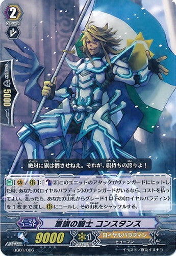 【自】【(V)/(R)】:[【カウンターブラスト】(2)]このユニットのアタックがヴァンガードにヒットした時、あなたの《ロイヤルパラディン》のヴァンガードがいるなら、コストを払ってよい。払ったら、あなたの山札からグレード1以下の《ロイヤルパラディン》を1枚まで探し、(R)にコールし、その山札をシャッフルする。