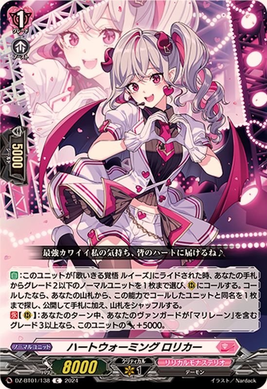 【自】:このユニットが「歌いきる覚悟 ルイーズ」にライドされた時、あなたの手札からグレード2以下のノーマルユニットを1枚まで選び、(R)にコールする。コールしたなら、あなたの山札から、この能力でコールしたユニットと同名を1枚まで探し、公開して手札に加え、山札をシャッフルする。【永】【(R)】:あなたのターン中、あなたのヴァンガードが「マリレーン」を含むグレード3以上なら、このユニットのパワー+5000。