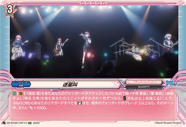 【自】【(R)】:「高松 燈」を含むあなたのヴァンガードがアタックしたバトル終了時、「千早 愛音」、「要 楽奈」、「長崎 そよ」、「椎名 立希」を含むあなたのユニットがそれぞれ1枚ずつなら、【コスト】[手札から1枚捨てる]ことで、〈MyGO!!!!!〉のあなたのリアガードすべてを【スタンド】させ、相手のヴァンガードがグレード3以上なら、そのターン中、さらにパワー+5000。