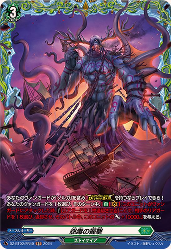 あなたのヴァンガードが「ゾルガ」を含み【ディヴァインスキル】を持つならプレイできる!あなたのヴァンガードを1枚選び、そのターン中、『【自】【(V)】:このユニットがヴァンガードにアタックした時、【コスト】[リアガードを1枚退却させる]ことで、相手のリアガードを1枚選び、退却させ、そのバトル中、このユニットのパワー+10000。』を与える。