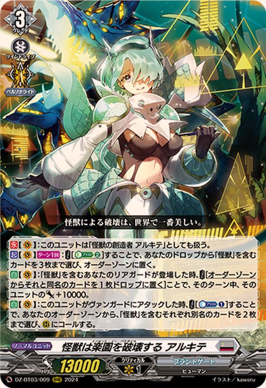 【永】【(V)】:このユニットは「怪獣の創造者 アルキテ」としても扱う。【起】【(V)】【ターン1回】:【コスト】[【エネルギーブラスト】(2)]することで、あなたのドロップから「怪獣」を含むカードを3枚まで選び、オーダーゾーンに置く。【自】【(V)】:「怪獣」を含むあなたのリアガードが登場した時、【コスト】[オーダーゾーンからそれと同名のカードを1枚ドロップに置く]ことで、そのターン中、そのユニットのパワー+10000。【自】【(V)】:このユニットがヴァンガードにアタックした時、【コスト】[【カウンターブラスト】(1)]することで、あなたのオーダーゾーンから、「怪獣」を含むそれぞれ別名のカードを2枚まで選び、(R)にコールする。