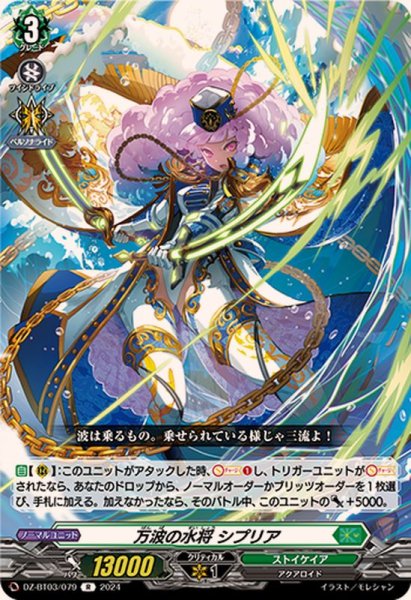 【自】【(R)】:このユニットがアタックした時、【ソウルチャージ】(1)し、トリガーユニットが【ソウルチャージ】されたなら、あなたのドロップから、ノーマルオーダーかブリッツオーダーを1枚選び、手札に加える。加えなかったなら、そのバトル中、このユニットのパワー+5000。