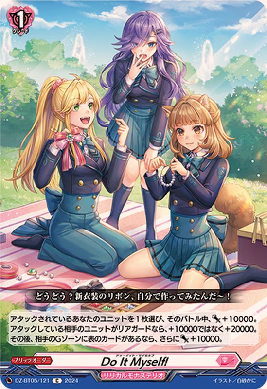 アタックされているあなたのユニットを1枚選び、そのバトル中、パワー+10000。アタックしている相手のユニットがリアガードなら、+10000ではなく+20000。その後、相手のGゾーンに表のカードがあるなら、さらにパワー+10000。