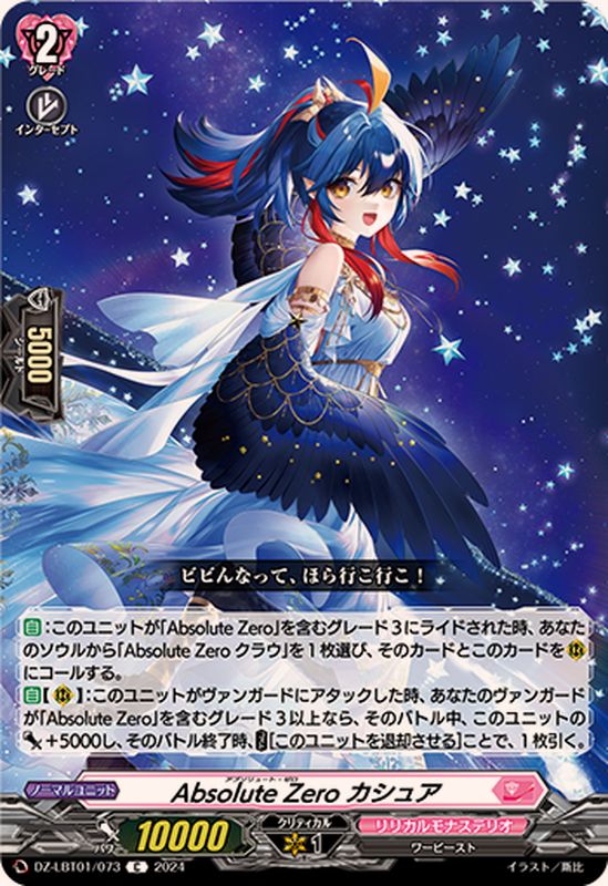 【自】:このユニットが「Absolute Zero」を含むグレード3にライドされた時、あなたのソウルから「Absolute Zero クラウ」を1枚選び、そのカードとこのカードを(R)にコールする。【自】【(R)】:このユニットがヴァンガードにアタックした時、あなたのヴァンガードが「Absolute Zero」を含むグレード3以上なら、そのバトル中、このユニットのパワー+5000し、そのバトル終了時、【コスト】[このユニットを退却させる]ことで、1枚引く。