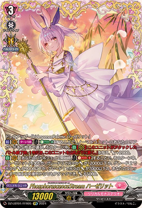 ドレスアップ-「IridescencePalette ハーゼリット」【起】【(V)】【ターン1回】:【コスト】[【エネルギーブラスト】(3)]することで、ノーマルユニットのあなたのリアガードを5枚まで選び、そのターン中、『【自】【(R)】:このユニットがアタックしたバトル終了時、1枚引き、このユニットを山札の下に置く。』を与え、パワー+2000。【自】【(V)】:あなたのバトルフェイズ開始時、【コスト】[【ソウルブラスト】(1)]することで、そのターン中、「ハーゼリット」を含むか、グレード3で元々のパワーが12000以下か、グレード2で元々のパワーが9000以下か、グレード1で元々のパワーが7000以下の、あなたのユニットすべては中央後列からでもアタックでき、パワー+5000。