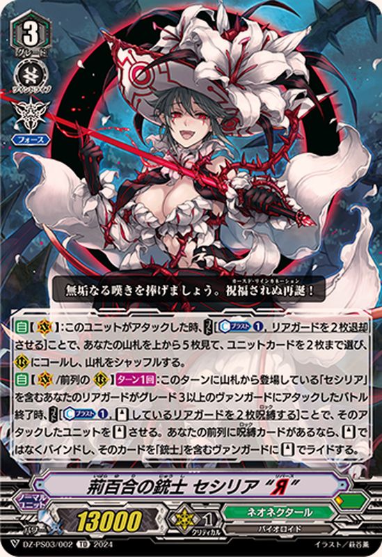 【自】【(V)】:このユニットがアタックした時、【コスト】[【カウンターブラスト】(1),リアガードを2枚退却させる]ことで、あなたの山札を上から5枚見て、ユニットカードを2枚まで選び、(R)にコールし、山札をシャッフルする。【自】【(V)/前列の(R)】【ターン1回】:このターンに山札から登場している「セシリア」を含むあなたのリアガードがグレード3以上のヴァンガードにアタックしたバトル終了時、【コスト】[【カウンターブラスト】(1),【スタンド】しているリアガードを2枚呪縛する]ことで、そのアタックしたユニットを【スタンド】させる。あなたの前列に呪縛カードがあるなら、【スタンド】ではなくバインドし、そのカードを「銃士」を含むヴァンガードに【スタンド】でライドする。