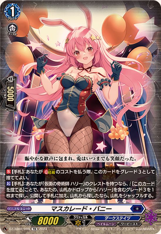 【永】【手札】:あなたが【超越】のコストを払う際、このカードをグレード3として捨ててよい。【起】【手札】:あなたが「仮面の奇術師 ハリー」のクレストを持つなら、【コスト】[このカードを捨てる]ことで、あなたの、山札かドロップから「ハリー」を含むグレード3を1枚まで探し、公開して手札に加え、山札から探したなら、山札をシャッフルする。