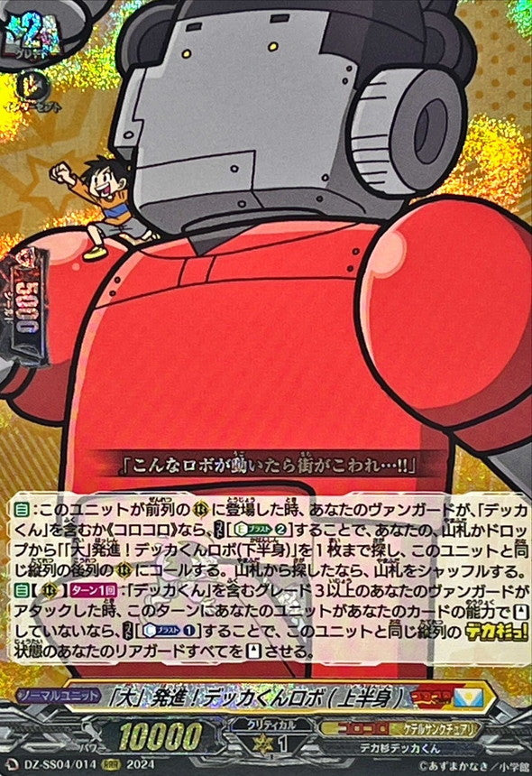 【自】:このユニットが前列の(R)に登場した時、あなたのヴァンガードが、「デッカくん」を含むか《コロコロ》なら、【コスト】[【エネルギーブラスト】(2)]することで、あなたの、山札かドロップから「「大」発進!デッカくんロボ(下半身)」を1枚まで探し、このユニットと同じ縦列の後列の(R)にコールする。山札から探したなら、山札をシャッフルする。【自】【(R)】【ターン1回】:「デッカくん」を含むグレード3以上のあなたのヴァンガードがアタックした時、このターンにあなたのユニットがあなたのカードの能力で【スタンド】していないなら、【コスト】[【カウンターブラスト】(1)]することで、このユニットと同じ縦列の【デカ杉っ!】状態のあなたのリアガードすべてを【スタンド】させる。