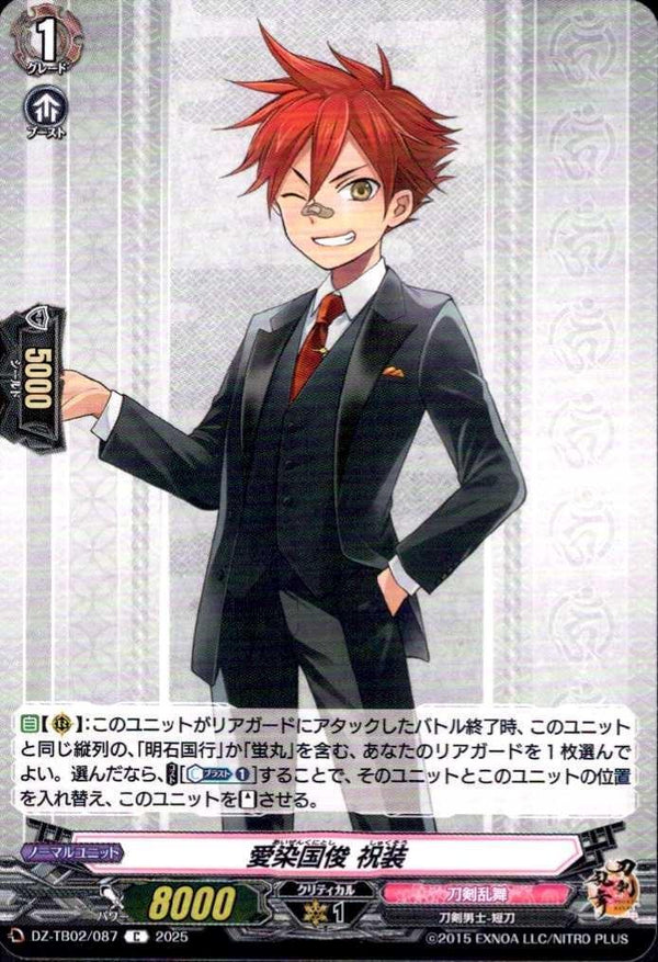 【自】【(R)】:このユニットがリアガードにアタックしたバトル終了時、このユニットと同じ縦列の、「明石国行」か「蛍丸」を含む、あなたのリアガードを1枚選んでよい。選んだなら、【コスト】[【カウンターブラスト】(1)]することで、そのユニットとこのユニットの位置を入れ替え、このユニットを【スタンド】させる。