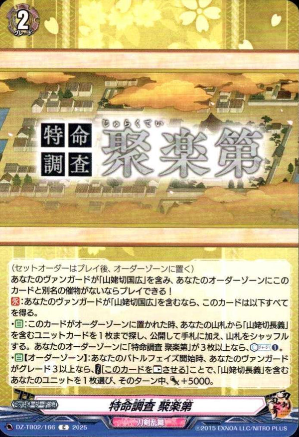 ・【自】:このカードがオーダーゾーンに置かれた時、あなたの山札から「山姥切長義」を含むユニットカードを1枚まで探し、公開して手札に加え、山札をシャッフルする。あなたのオーダーゾーンに「特命調査 聚楽第」が3枚以上なら、【カウンターチャージ】(1)。