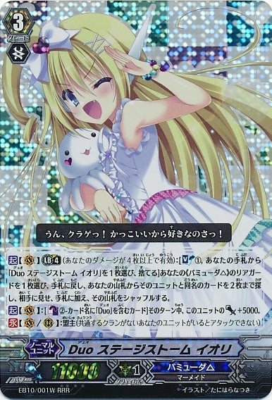 【起】【(V)】【リミットブレイク】(4)(あなたのダメージが4枚以上で有効):[【ソウルブラスト】(1),あなたの手札から「Duo ステージストーム イオリ」を1枚選び、捨てる]あなたの《バミューダ△》のリアガードを1枚選び、手札に戻し、あなたの山札からそのユニットと同名のカードを2枚まで探し、相手に見せ、手札に加え、その山札をシャッフルする。【起】【(V)】:[【カウンターブラスト】(2)-カード名に「Duo」を含むカード]そのターン中、このユニットのパワー+5000。【永】【(V)/(R)】:盟主(共通するクランがないあなたのユニットがいるとアタックできない)