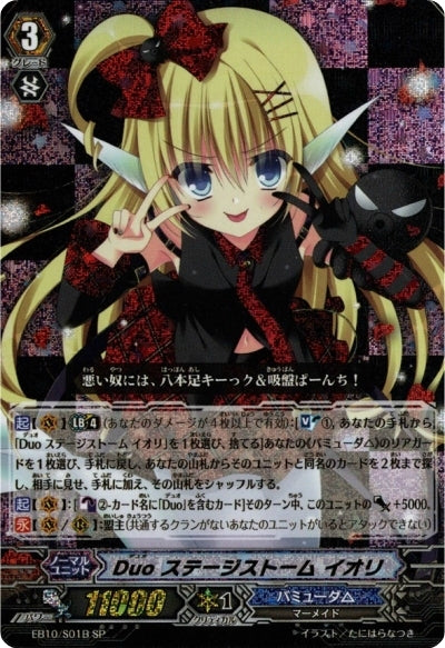 【起】【(V)】【リミットブレイク】(4)(あなたのダメージが4枚以上で有効):[【ソウルブラスト】(1),あなたの手札から「Duo ステージストーム イオリ」を1枚選び、捨てる]あなたの《バミューダ△》のリアガードを1枚選び、手札に戻し、あなたの山札からそのユニットと同名のカードを2枚まで探し、相手に見せ、手札に加え、その山札をシャッフルする。【起】【(V)】:[【カウンターブラスト】(2)-カード名に「Duo」を含むカード]そのターン中、このユニットのパワー+5000。【永】【(V)/(R)】:盟主(共通するクランがないあなたのユニットがいるとアタックできない)