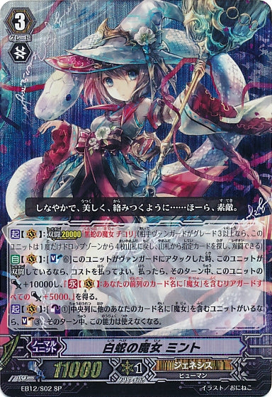 【起】【(V)】:【双闘20000】「黒蛇の魔女 チコリ」(相手ヴァンガードがグレード3以上なら、このユニットは1度だけドロップゾーンから4枚山札に戻し、山札から指定カードを探し、双闘できる)【自】【(V)】:[【ソウルブラスト】(6)]このユニットがヴァンガードにアタックした時、このユニットが【双闘】しているなら、コストを払ってよい。払ったら、そのターン中、このユニットのパワー+10000し、『【永】【(V)】:あなたの前列のカード名に「魔女」を含むリアガードすべてのパワー+5000。』を得る。【起】【(V)】:[【カウンターブラスト】(1)]中央列に他のあなたのカード名に「魔女」を含むユニットがいるなら、【ソウルチャージ】(3)。そのターン中、この能力は使えなくなる。