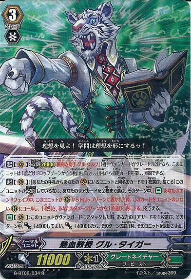 【起】【(V)】:【双闘20000】「腕利き助手 グル・ウルフ」(相手ヴァンガードがグレード3以上なら、このユニットは1度だけドロップゾーンから4枚山札に戻し、山札から指定カードを探し、双闘できる)【起】【(V)】:[あなたの手札からあなたの(V)にいるユニットと同名のカードを1枚選び、捨てる]このユニットが【双闘】しているなら、あなたのリアガードを2枚まで選び、そのターン中、『【自】:あなたのエンドフェイズ中、このユニットが(R)からドロップゾーンに置かれた時、このカードをユニットのいない(R)にコールし、1枚引き、あなたのダメージゾーンから1枚選び、表にする。』を与える。【自】【(V)】:このユニットがヴァンガードにアタックした時、あなたのリアガードを1枚選び、そのターン中、パワー+4000してよい。パワー+4000したら、そのターンの終了時、そのユニットを退却させる。