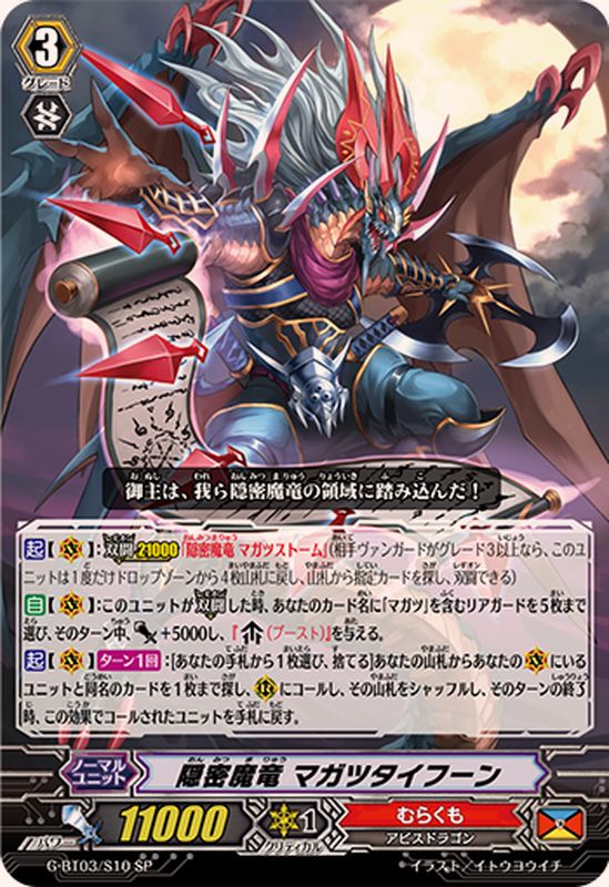 【起】【(V)】:【双闘21000】「隠密魔竜 マガツストーム」(相手ヴァンガードがグレード3以上なら、このユニットは1度だけドロップゾーンから4枚山札に戻し、山札から指定カードを探し、双闘できる)【自】【(V)】:このユニットが【双闘】した時、あなたのカード名に「マガツ」を含むリアガードを5枚まで選び、そのターン中、パワー+5000し、『【ブースト】』を与える。【起】【(V)】【ターン1回】:[あなたの手札から1枚選び、捨てる]あなたの山札からあなたの(V)にいるユニットと同名のカードを1枚まで探し、(R)にコールし、その山札をシャッフルし、そのターンの終了時、この効果でコールされたユニットを手札に戻す。
