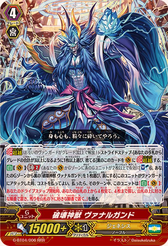 【超越】(お互いのヴァンガードがグレード3以上で解放!)-ストライドステップ-[あなたの手札からグレードの合計が3以上になるように1枚以上選び、捨てる]裏のこのカードを (V)に【超越】する。【自】【(V)】【Gブレイク】(2)(あなたの (V)かGゾーンに表のGユニットが2枚以上で有効):[【ソウルブラスト】(6),あなたのGゾーンから裏の「破壊神獣 ヴァナルガンド」を1枚選び、表にする]このユニットがヴァンガードにアタックした時、コストを払ってよい。払ったら、そのターン中、このユニットは『【自】【(V)】:あなたのドライブステップ開始時、あなたの山札の上から4枚見て、4枚まで探し、山札の上に好きな順番で置き、残りを山札の下に好きな順番で置く。』を得る。