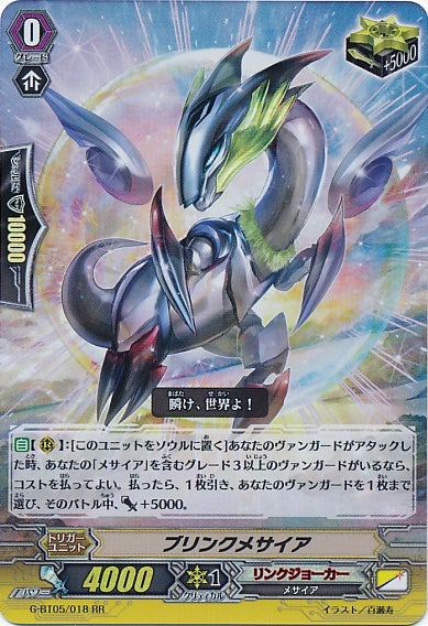 アップデート:シールド、トリガー、テキスト【自】【(R)】:「メサイア」を含むグレード3以上のあなたのヴァンガードがアタックした時、【コスト】[このユニットをソウルに置く]ことで、1枚引き、あなたのヴァンガードを1枚選び、そのバトル中、パワー+5000。【自】:このカードがダメージチェックで出た時、1枚引く。
