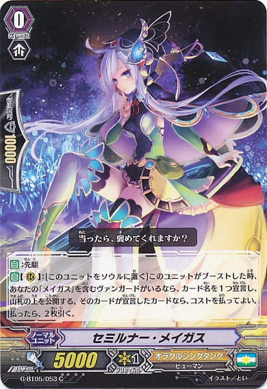 【自】:先駆【自】【(R)】:[このユニットをソウルに置く]このユニットがブーストした時、あなたの「メイガス」を含むヴァンガードがいるなら、カード名を1つ宣言し、山札の上を公開する。そのカードが宣言したカードなら、コストを払ってよい。払ったら、2枚引く。