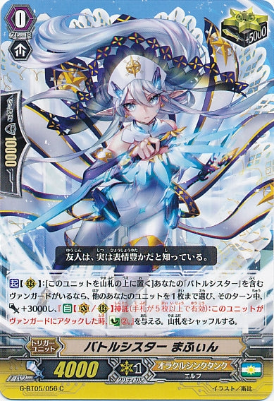 【起】【(R)】:[このユニットを山札の上に置く]あなたの「バトルシスター」を含むヴァンガードがいるなら、他のあなたのユニットを1枚まで選び、そのターン中、パワー+3000し、『【自】【(V)/(R)】神託(手札が5枚以上で有効):このユニットがヴァンガードにアタックした時、【カウンターチャージ】(2)。』を与える。山札をシャッフルする。