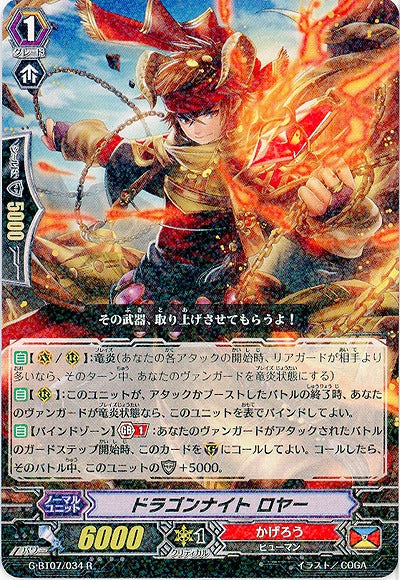【自】【(V)/(R)】:竜炎(あなたの各アタックの開始時、リアガードが相手より多いなら、そのターン中、あなたのヴァンガードを竜炎状態にする)【自】【(R)】:このユニットが、アタックかブーストしたバトルの終了時、あなたのヴァンガードが竜炎状態なら、このユニットを表でバインドしてよい。【自】【バインドゾーン】【Gブレイク】(1):あなたのヴァンガードがアタックされたバトルのガードステップ開始時、このカードを(G)にコールしてよい。コールしたら、そのバトル中、このユニットのシールド+5000。