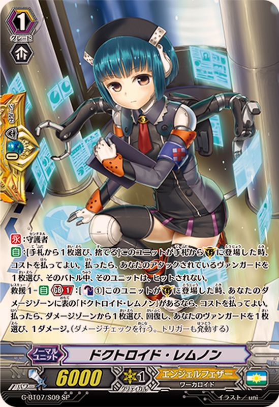 【永】:守護者【自】:[手札から1枚選び、捨てる]このユニットが手札から(G)に登場した時、コストを払ってよい。払ったら、あなたのアタックされているヴァンガードを1枚選び、そのバトル中、そのユニットは、ヒットされない。救援1-【自】【Gブレイク】(1):[【カウンターブラスト】(1)]このユニットが(G)に登場した時、あなたのダメージゾーンに表の「ドクトロイド・レムノン」があるなら、コストを払ってよい。払ったら、ダメージゾーンから1枚選び、回復し、あなたのヴァンガードを1枚選び、1ダメージ。(ダメージチェックを行う。トリガーも発動する)