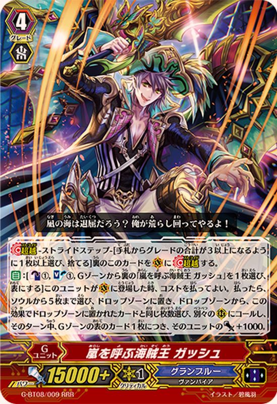 【超越】-ストライドステップ-[手札からグレードの合計が3以上になるように1枚以上選び、捨てる]裏のこのカードを(V)に【超越】する。【自】:[【カウンターブラスト】(1),【ソウルブラスト】(1),Gゾーンから裏の「嵐を呼ぶ海賊王 ガッシュ」を1枚選び、表にする]このユニットが(V)に登場した時、コストを払ってよい。払ったら、ソウルから5枚まで選び、ドロップゾーンに置き、ドロップゾーンから、この効果でドロップゾーンに置かれたカードと同じ枚数選び、別々の(R)にコールし、そのターン中、Gゾーンの表のカード1枚につき、そのユニットのパワー+1000。